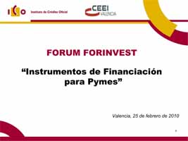 Este documento contiene las ponencias que Rosalía Martos (ICO), Ignacio Aguado (ENISA) y Luís Enrique San José (CDTI) expusieron en la jornada "Instrumentos de Financiación para Pymes" organizada por CEEI Valencia, el pasado 25 de febrero de 2010, en el marco de Forinvest.