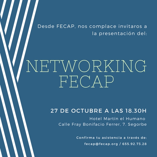El próximo jueves 27 de octubre a partir de las 18h, con la recepción de los invitados, tendrá lugar en el Hotel Martín el Humano (C/ Fray Bonifació Ferrer nº 7, Segorbe) la presentación del Networking FECAP.
