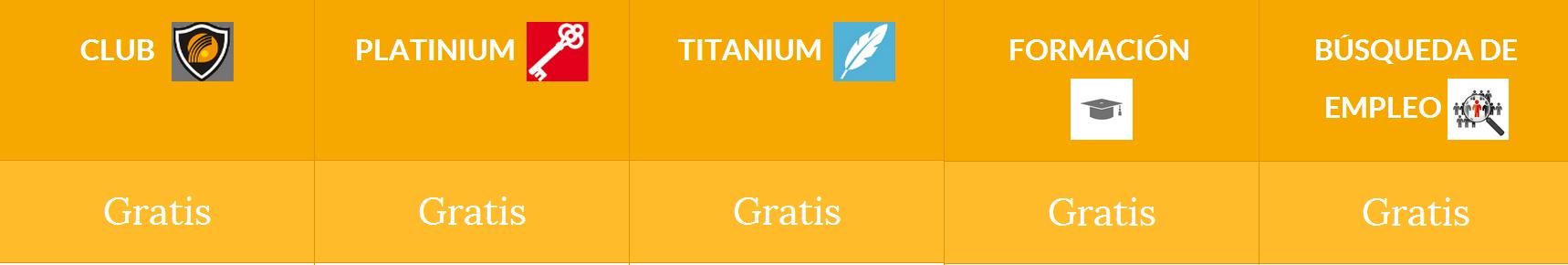 Elige el que más te guste: Club, Platinium, Titanium, Formación y Búsqueda Activa de Empleo,  o puedes elegir varios a la vez, pues son compatibles todos ellos con una serie de ventajas y beneficios totalmente gratis; te avanzo unas líneas.
