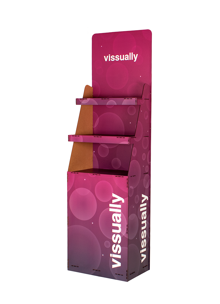 Expositor comercial de pie para punto de venta. Fabricado con fibra de madera renovable, MDF, cortado mediante láser e impreso digitalmente el logotipo en HD en la parte superior.