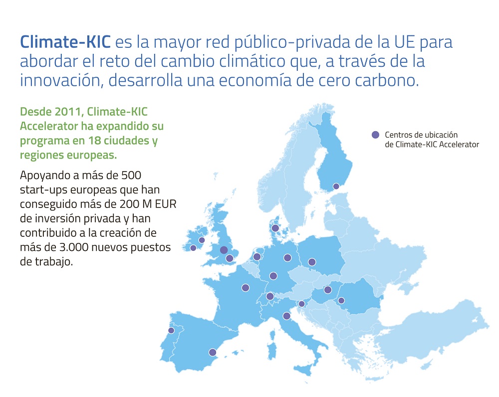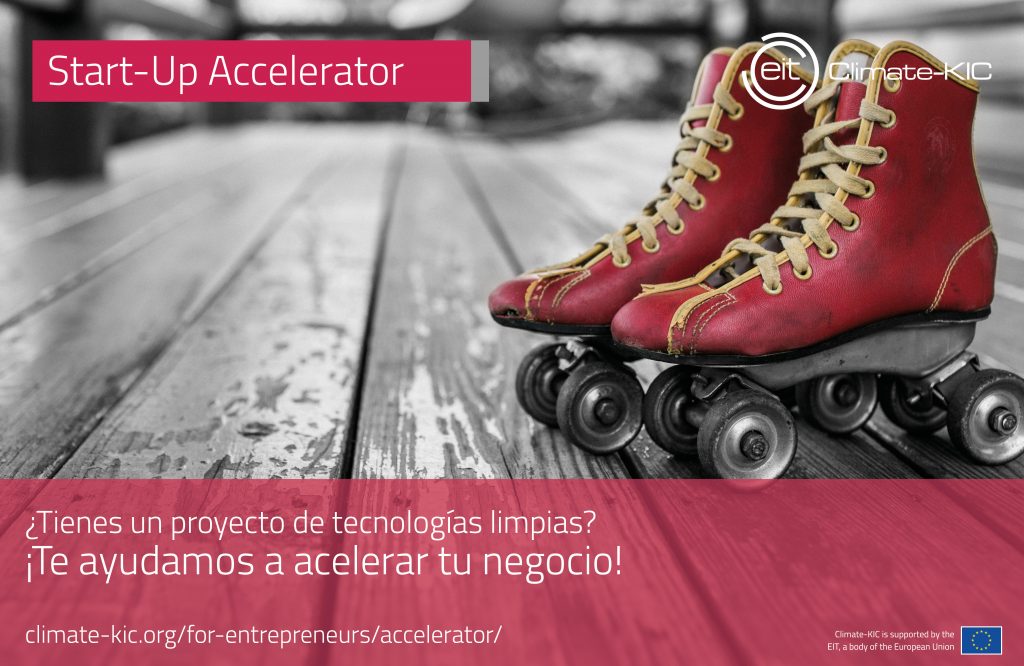 Climate-KIC Accelerator es la única aceleradora Clean Tech en España y la mayor de Europa. Climate-KIC Accelerator ofrece apoyo económico y de formación para las mejores start-ups que mitigan el cambio climático. La financiación no reembolsable puede alcanzar los 90.000 euros, sin toma de participación en la empresa.
