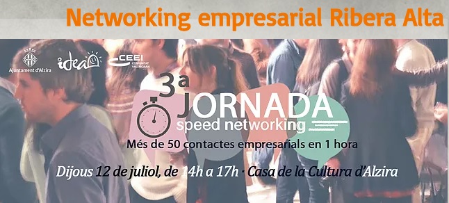 IDEA y el CEEI Valencia, organizan la Jornada: Networking Empresarial Ribera Alzira, que tendrá lugar el miércoles, 12 de julio de 2018 a la Casa de la Cultura, en horario de 14h a 17h.
