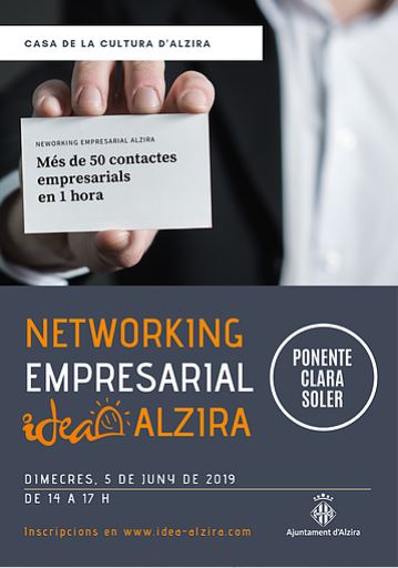 L'Ajuntament d'Alzira, mitjançant IDEA, organitza la 5ª Jornada de Networking Empresarial que tindrà lloc el dimecres 5 de juny, a la Casa de la Cultura d'Alzira, en horari de 14 a 17 hores.