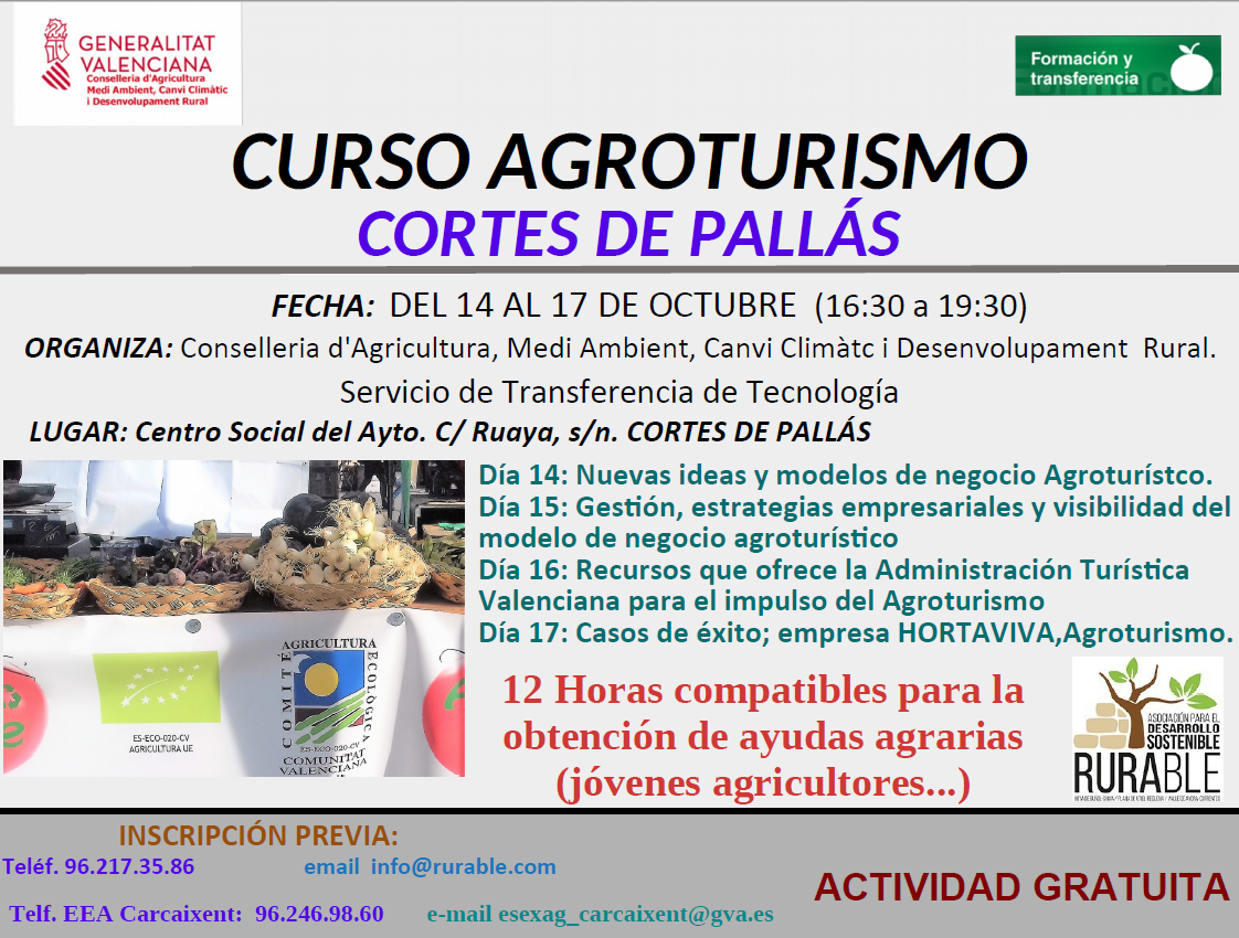 La Conselleria d'Agricultura, a través de las Estaciones Experimentales Agrarias de Carcaixent y Vila-real, pertenecientes al Servicio de Transferencia de Tecnología, y en colaboración con Rurable (Grupo Acción Local), organiza este curso Agroturismo en Cortes de Pallás, repartido en 4 sesiones, y dirigido a todas aquellas personas que estén o que vayan a estar en el sector agroturístico o que tengan inquietud en el mismo.