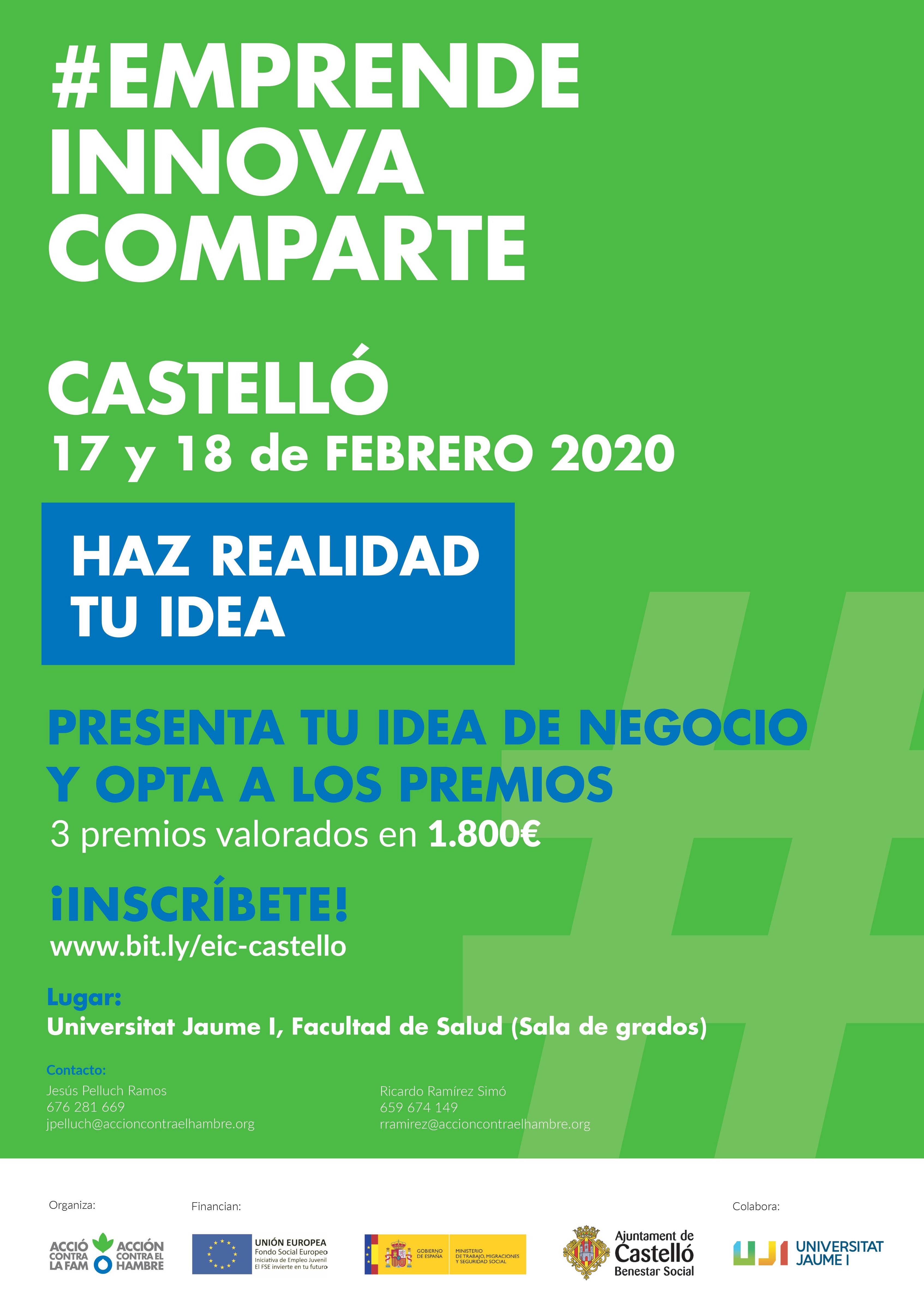 #EmprendeInnovaComparte Castelló es una jornada gratuita en la que compartimos experiencias de emprendimiento, aprendemos a través de talleres participativos y lúdicos y conocemos las distintas ideas de negocio de las personas participantes. Y, además, si participas en la parte del concurso podrás ganas premios que impulsarán tu idea.