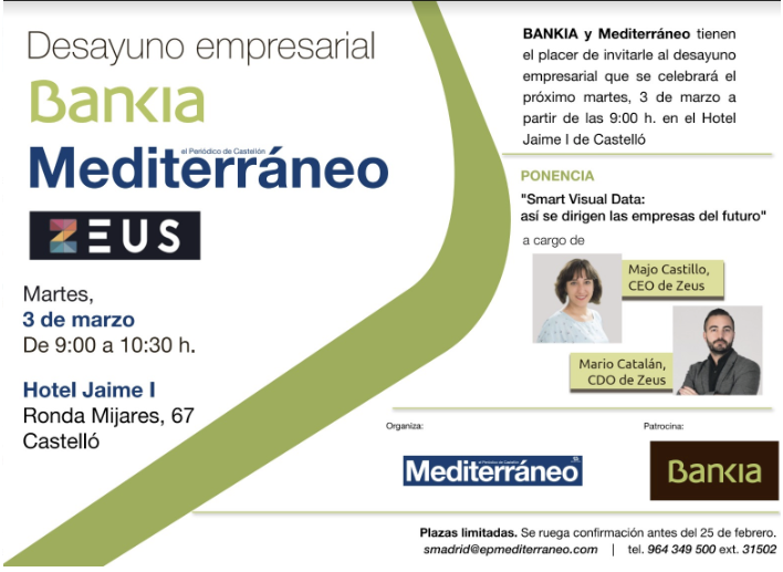 BANKIA y MEDITERRÁNEO tienen el placer de invitarle al desayuno empresarial que se celebrará el próximo martes, 3 de marzo a partir de las 9:00 h. en el Hotel Jaume I de Castellón.