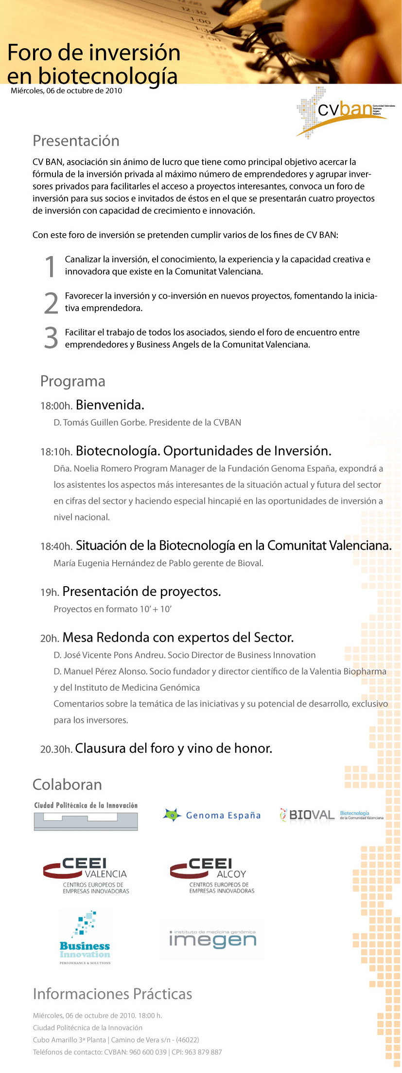 El objetivo del encuentro, que contará con responsables del genoma en España y expertos del sector, es dar a conocer la situación de la biotecnología en la Comunidad Valenciana así como las oportunidades de inversión.
