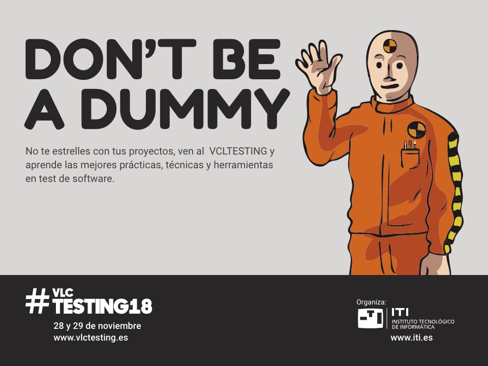 El presente año VLCTesting quiere destacar la importancia del test con espíritu Crash Test Dummy.  Igual que los Crash test dummies se convirtieron en esenciales para las pruebas automovilísticas, un proyecto de desarrollo de software sin actividades de prueba puede hacer estrellar el producto antes de iniciar su andadura.