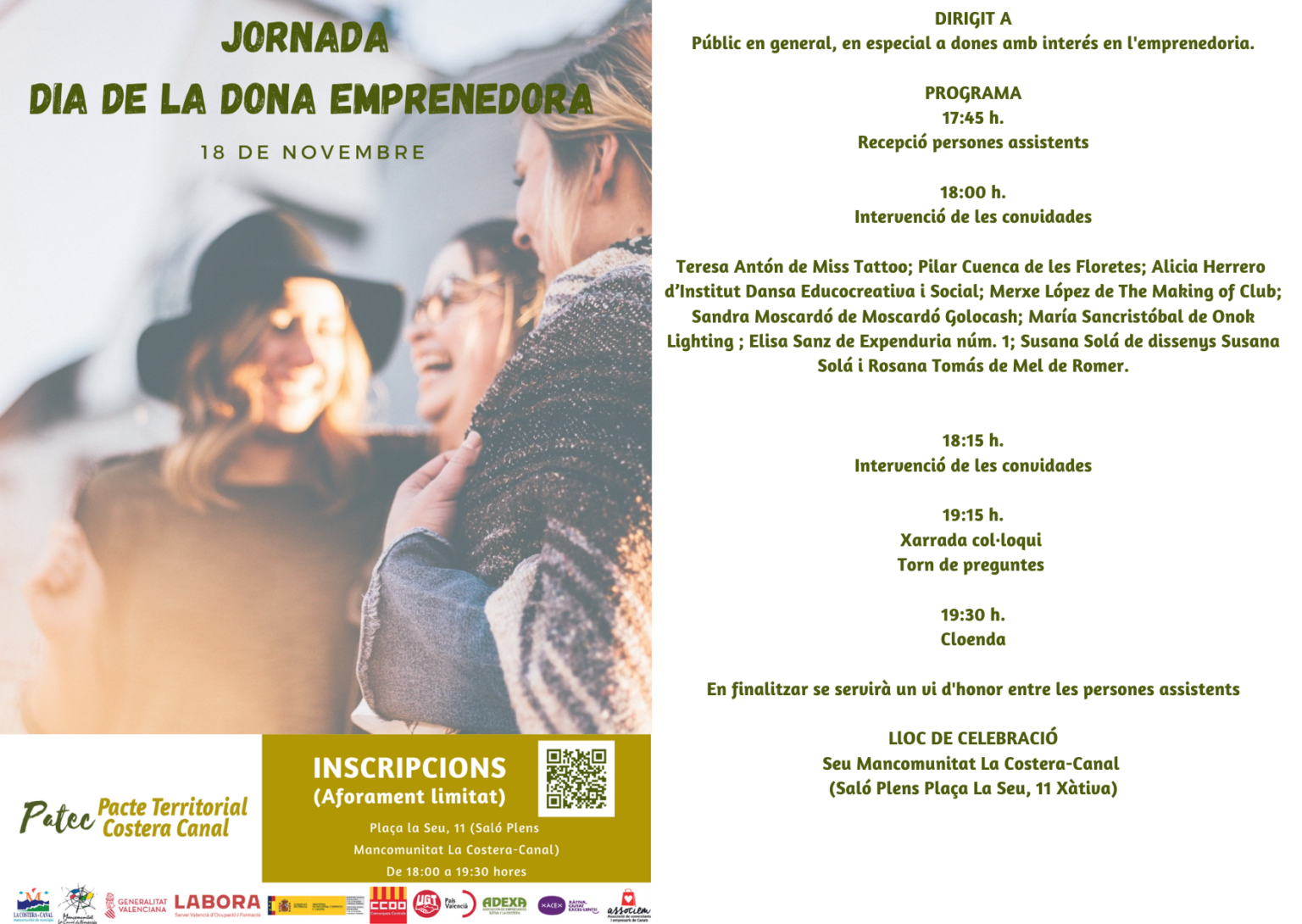 Con motivo del Dia de la Mujer Emprendedora,  el Pacte Territorial conmemorará la tarde del jueves 18 de noviembre a las 18h en el salón de plenos de la Mancomunitat La Costera-Canal, la I Jornada de la Mujer Emprendedora. Este evento está dirigido al público en general y a las mujeres con interés en el emprendimiento en particular.