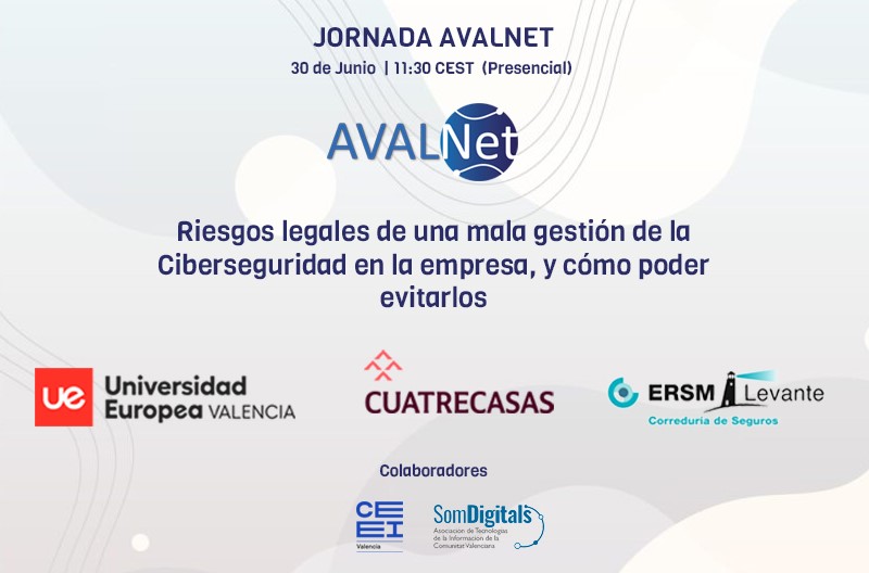 El próximo jueves 30 de junio de 11:30h a 13:45h, tendrá lugar la jornada "Riesgos legales de una mala gestión de la Ciberseguridad en la empresa, y cómo poder evitarlos" organizada por AVALNET sobre riesgos en Ciberseguridad, en la Universidad Europea de Valencia.