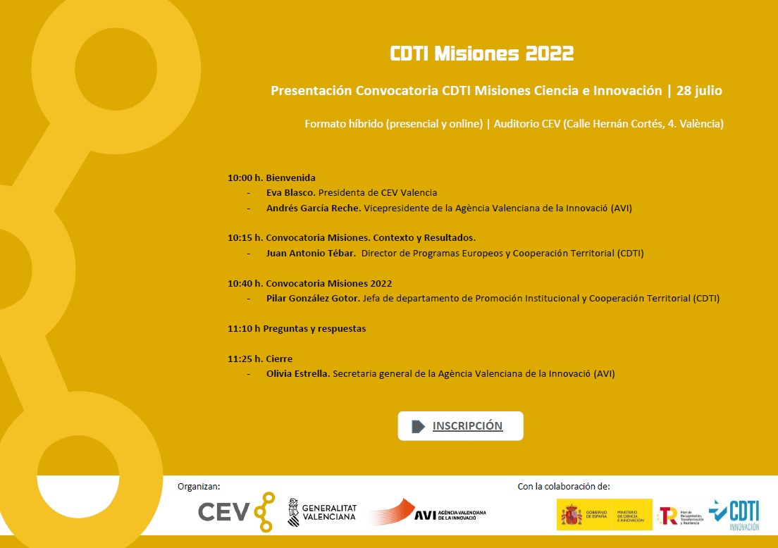 Jornada CEV-AVI: CDTI Misiones 2022. Presentación Convocatoria CDTI Misiones Ciencia e Innovación