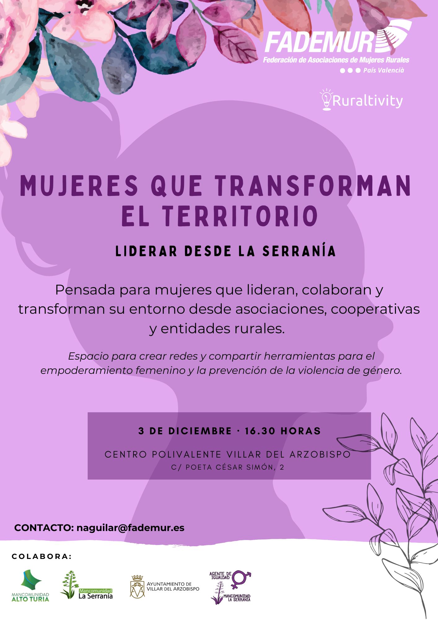 FADEMUR Comunitat Valenciana organiza el próximo 3 de diciembre a las 16:30 horas la jornada “Liderar desde la Serranía: Mujeres que transforman el territorio”, la primera de una serie de encuentros que se replicarán en distintas comarcas de la Comunitat Valenciana.