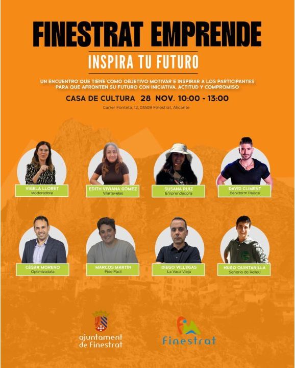 El viernes 28 de noviembre llega a la Casa de Cultura “FINESTRAT EMPRENDE”, una iniciativa de la Concejalía de Empleo y de Formación, también de la Concejalía de Empresa, dirigida a fomentar la cultura emprendedora y poner en valor el talento local.