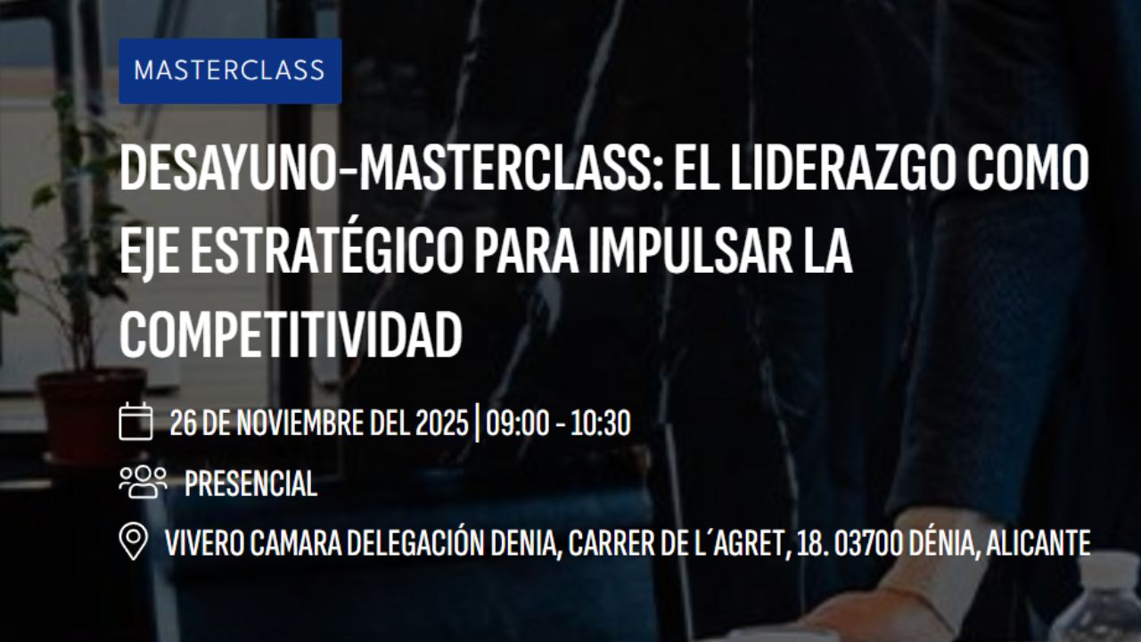 El 26 de noviembre de 2025, el Vivero de Empresas de Dénia acogerá un nuevo Desayuno Masterclass bajo el título “El liderazgo como eje estratégico para impulsar la competitividad”, organizado por ESIC, CEDMA y JOVEMPA, con la colaboración de Cámara Alicante.