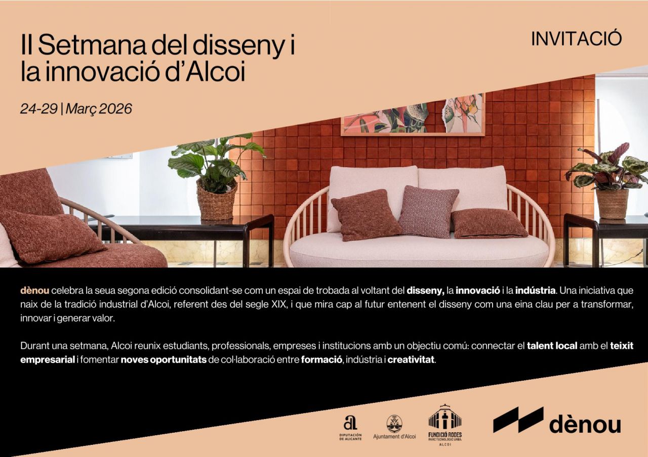 dènou celebra su segunda edición consolidándose como un espacio de encuentro en torno al diseño, la innovación y la industria. Una iniciativa que parte de la tradición industrial de Alcoy, referente desde el siglo XIX, y que mira al futuro entendiendo el diseño como una herramienta clave para transformar, innovar y generar valor.