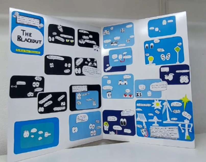 Los alumnos del IES DIPUTACIÓN Penyeta han realizado una campaña para los centros educativos basada en un "cómic gigante" que han dibujado entre todos titulado "El apagón" para concienciar sobre la importancia del uso de las energías renovables marinas.