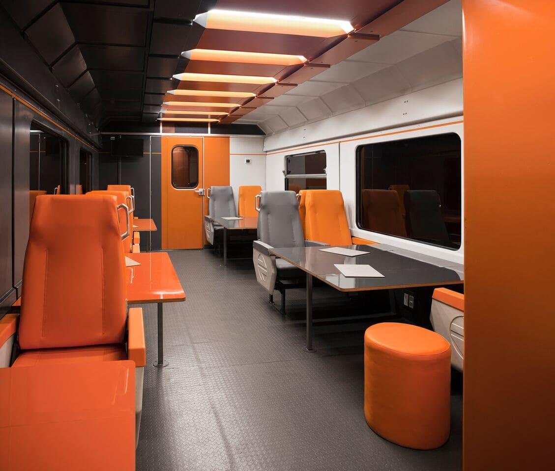 El coworking "El Camello" está dividido en varias áreas funcionales: un auditorio amarillo con asientos reversibles y pantallas para presentaciones, una sala de trabajo naranja equipada con mesas y sillas, y una sala verde polivalente con una trampilla que se puede elevar para formar una mesa de reuniones. Cada espacio tiene un esquema de colores y una función específica, adaptando el vagón a las necesidades actuales mientras se preservan sus características históricas.