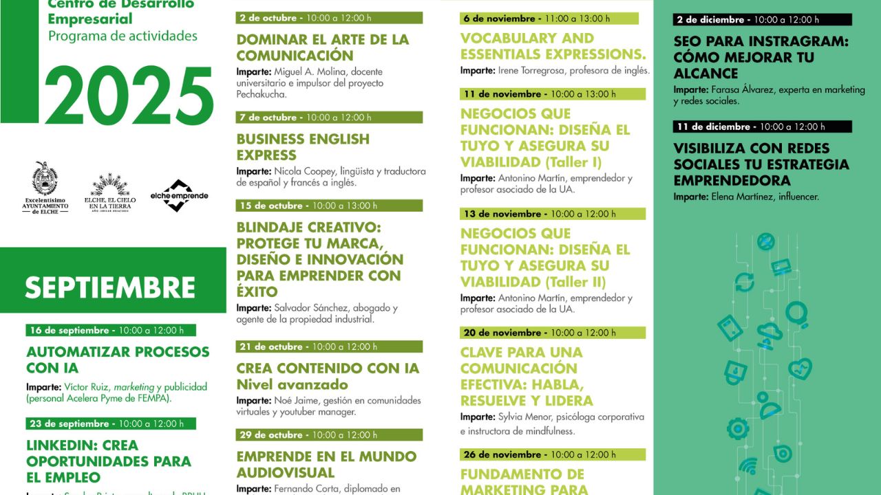 El Centro de Desarrollo Empresarial "Elche Emprende" (CDE), un servicio del Ayuntamiento de Elche, ha presentado el programa de actividades para emprendedores para el último cuatrimestre del 2025. Los cursos y las jornadas se centran principalmente en las áreas de marketing digital, sostenibilidad y gestión empresarial.