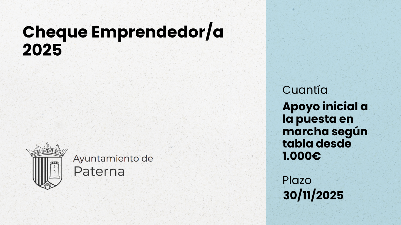 Para nuevos/as emprendedores/as con actividades iniciadas en Paterna entre el 1 de diciembre de 2024 y el 30 de noviembre de 2025, siempre que mantengan la actividad un mínimo de 12 meses.