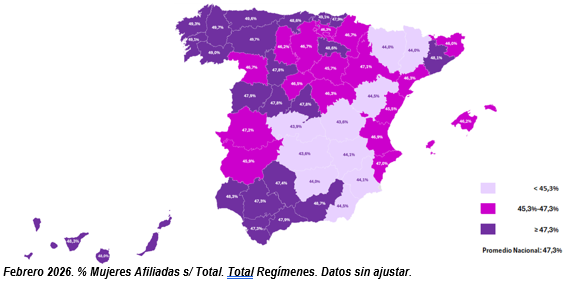 Las mujeres afiliadas superan por 13º mes consecutivo los 10 millones, con un total de 10.257.248 ocupadas, que representan el 47,3 % del total de afiliados. El crecimiento se observa en todos los grupos de edad, especialmente entre menores de 30 años (+35,6 %) y mayores de 55 años (+28,6 %). Desde la reforma laboral, la afiliación femenina ha aumentado un 16,8 %, superior al crecimiento de los hombres.