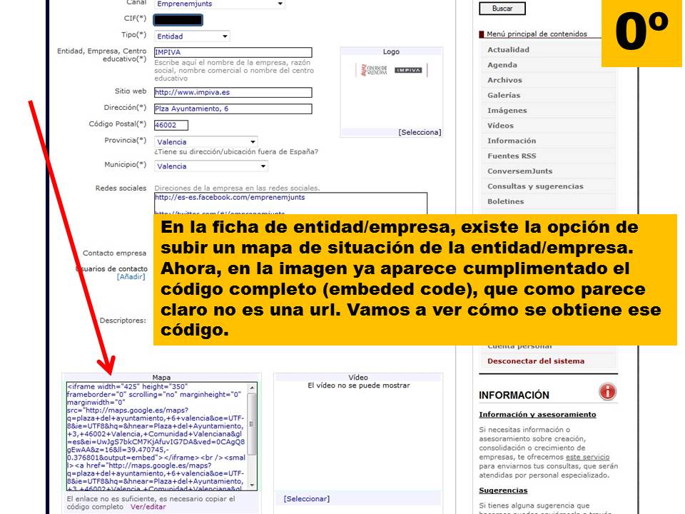 En la ficha de Entidad/Empresa, como se ve en la figura-imágen 0 situada en el lateral de este registro, vemos un campo de la ficha "mapa" en el que hay un "código completo" (embeded code) incluido en el campo previsto para subir el mapa.