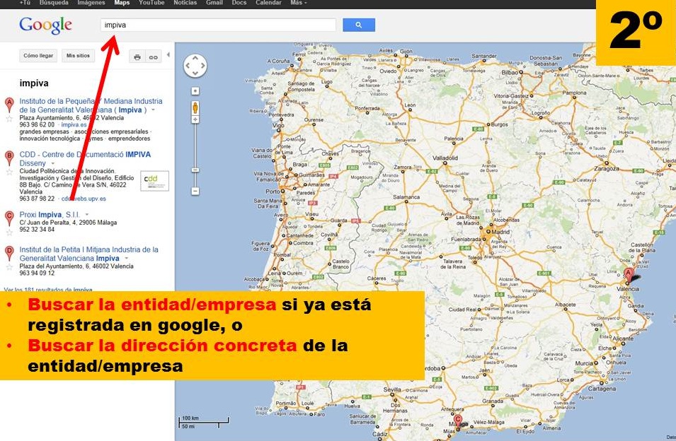 Como se indica en la figura-imágen 1, hemos de ir al google maps para, en su caso, "buscar" la situación de la entidad/empresa, si ya estuviera registrada en google, o bien poder buscar la dirección concreta de la entidad/empresa.