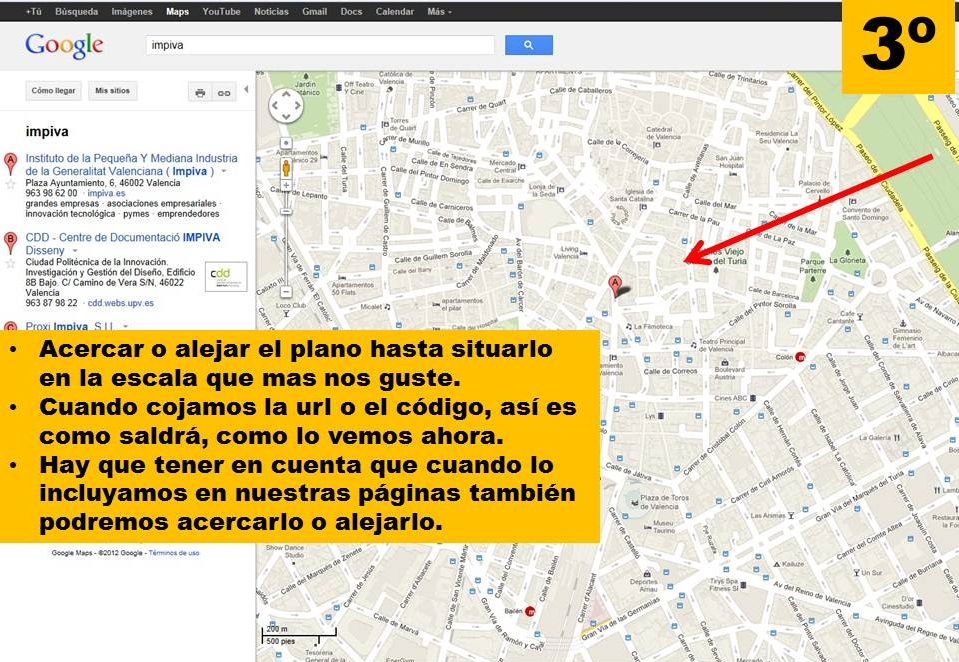 A continuación, figura-imágen 3, lo que hacemos es acercar o alejar el plano hasta que quede a nuestro gusto y que mejor facilite la comprensión y visión de la situación de la Entidad/Empresa. Hay que tener en cuenta que, una vez llevemos el plano a nuestra página, el usuario también podrá acercar o alejar el plano.