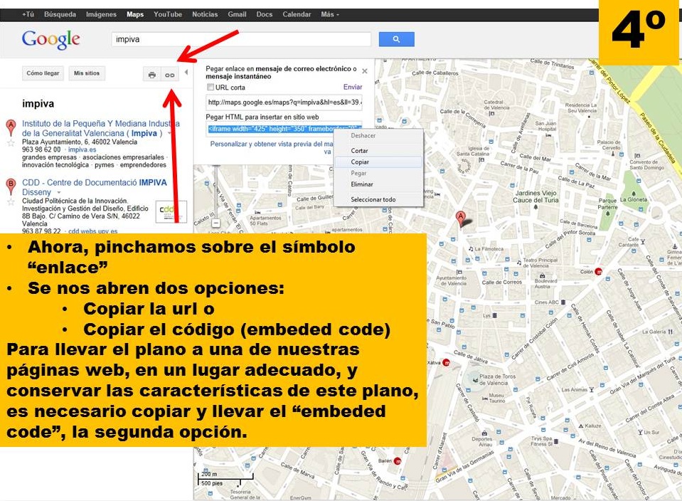 En la figura-imágen 4 se indica el botón sobre el que hay que pinchar (símbolo de enlace) y muestra las dos opciones que ofrece google maps, una, la url, y dos, el código de incrustación. Éste último aparece seleccionado en azul. Hemos de copiar ese código y llevarlo al campo mapa que aparece en la figura-imágen 0.