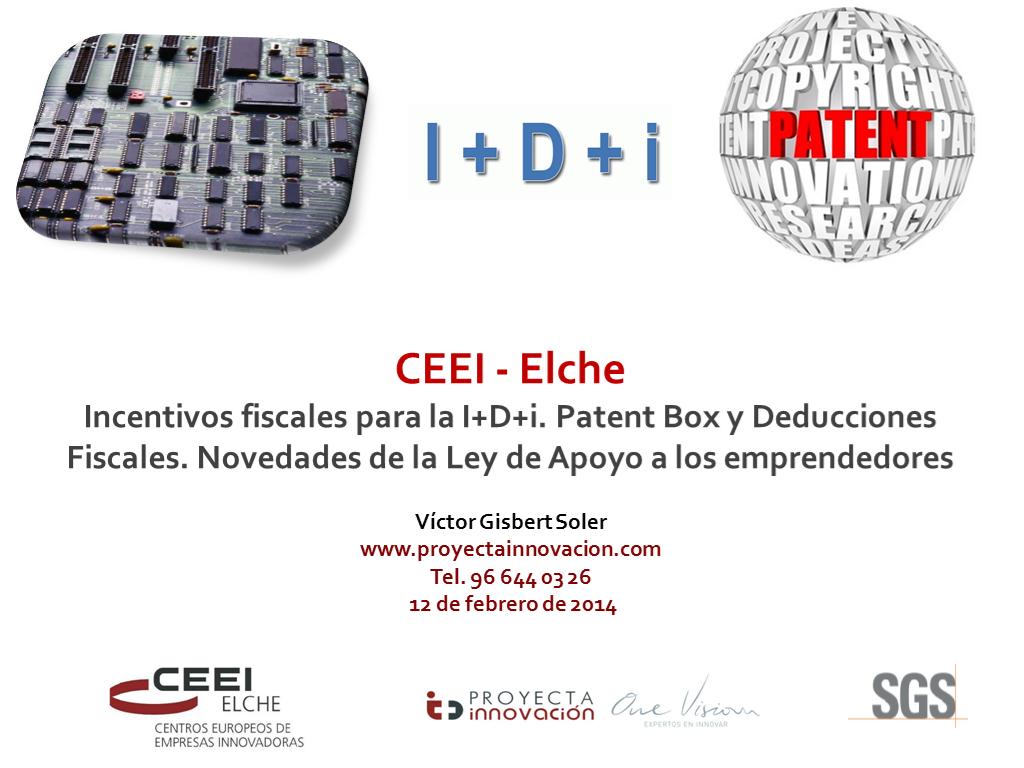 La exposición de la ponencia se realizó el 12 de febrero de 2014 en CEEI Elche durante la jornada Incentivos fiscales para la I+D+i. Novedades de la Ley de Apoyo a los emprendedores