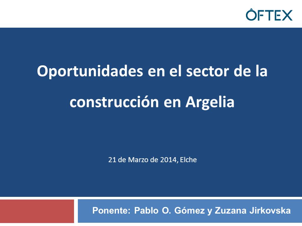 La exposición de la ponencia se realizó el 21 de marzo de 2014 en CEEI Elche durante la jornada Descubre las últimas oportunidades de negocio en este mercado: ARGELIA