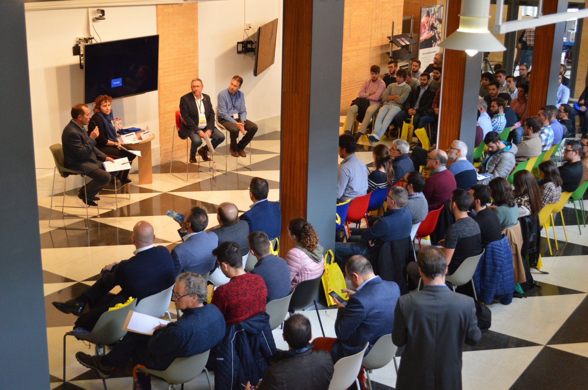 El Plenario con los ponentes: Júlia Company Directora General del IVACE, Álvaro Soler de Multisan Technologies, Sergi Belda de Imasd Robotics y modera Jaime Masiá Director del Máster de Robótica del Campus de Alcoy.