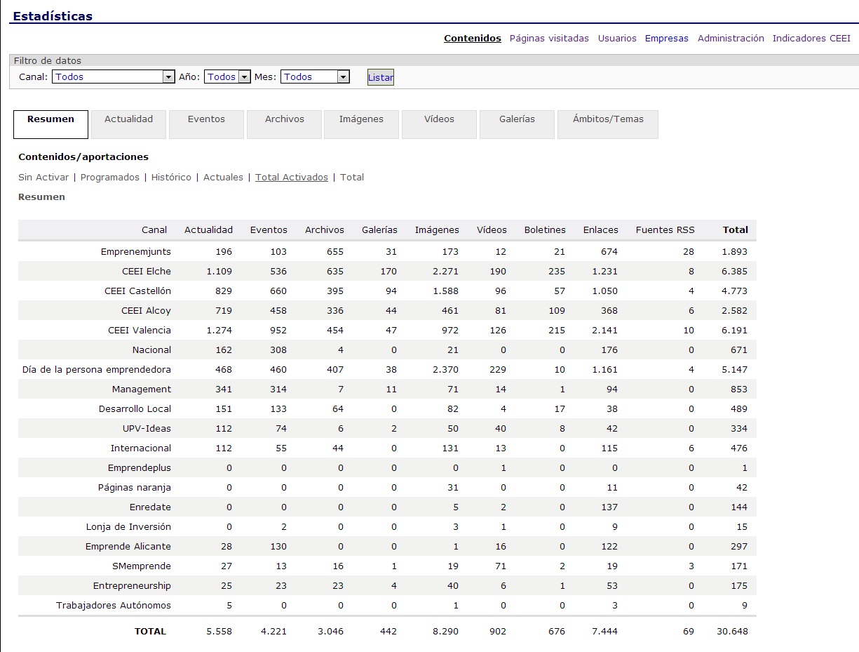 - Estadísticas de cada una de las fichas de contenidos: Actualidad, Eventos, Archivos, Galerías, Imágenes, Videos, Boletines, Enlaces y Fuentes rss,