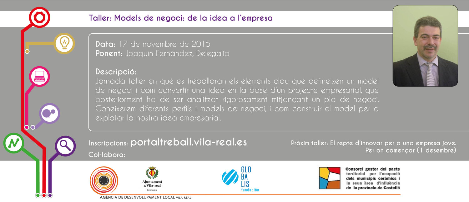 Descripción: Jornada-taller en la que se trabajarán los elementos clave que definen un modelo de negocio, y cómo convertir una idea en la base de un proyecto empresarial, que posteriormente ha de ser analizado rigurosamente mediante un plan de negocio. Conoceremos diferentes perfiles y modelos de negocio, y cómo construir el modelo para explotar nuestra idea empresarial.